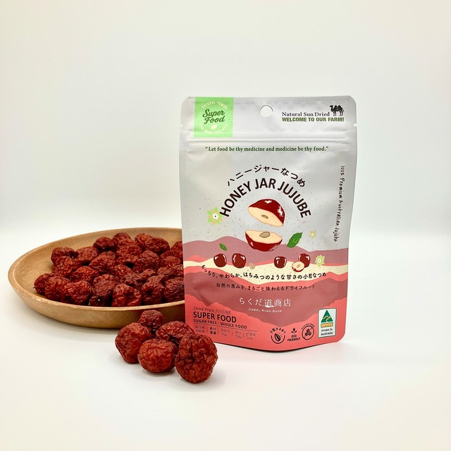 オーストラリア産ハニージャーなつめが装いも新たに新登場❗️ ⁑⁑⁑ ⁑⁑⁑ カンガルーがやってくるナツメ畑 ⁑⁑⁑ ⁑⁑⁑ ◇日本初!オーストラリア産ハニージャーなつめ 35g 3袋 先行販売から皆様から大好評を得ていたオーストラリア産ハニージャーなつめ! オーストラリアの家族経営のなつめ生産者が愛情を込めて育てた、幻のなつめが日本初上陸! 世界でもほとんど栽培している生産者がいない "ハニージャーなつめ" なつめの品種の中でも小粒の果実で丸い形のハニージャー。名前の通り蜂蜜みたいな濃厚な甘さが特徴です。 一つ一つ完熟している果実をすべて手作業で摘み取り、丁寧に選別してオーストラリアの豊かな太陽光で天日干しのみで仕上げた至極の逸品です。 オーガニック先進国オーストラリアならではの抗生物質やホルモン剤、農薬などの汚染の無い、本物の完熟有機肥料を使用した栽培方法で、もちろん無農薬、無添加で生産されております。 心優しい生産者家族の愛情がたっぷりこもった超稀少なハニージャーなつめをどうぞご賞味ください! オーストラリア産ハニージャーなつめが購入できるのはらくだ道商店だけ! ◇日本ではなつめ(棗)は、 古来から茶菓子としても使われてきた 日本人にとても馴染み深い果実です。 戦前までは"一家に一本あれば医者入らず"と言われる柿や柚子、枇杷の木と同じように棗の木も植えられていました。 長寿地域でも食されているなつめには様々な栄養価が含まれていて、精神や体の健康に寄与する効能がたくさんあることが近年の研究で明らかになっています。 中国のことわざでは「一日3粒のナツメを食べれば百歳になっても老いて見えない」とも称されるなつめ。 そのままドライフルーツとして、煮出してなつめ茶として、鍋やお料理に加えて、ぜひ毎日の生活に効果的に取り入れてみてください⭐︎⭐︎⭐︎ 賞味期限 製造日から2年 ※ 35g ※自然のものですので様々な形、キズなどがあるものがありますが品質には問題ございません。 1袋はこちら→ https://rakudado.theshop.jp/items/95883350 5袋セットはこちら→ https://rakudado.theshop.jp/items/95883939 お得な10袋セット!→ https://rakudado.theshop.jp/items/128612368 ✴︎配送について✴︎ ■5袋までクリックポスト発送可(郵便ポストへの投函) その他、宅急便コンパクト、ゆうパックで発送。