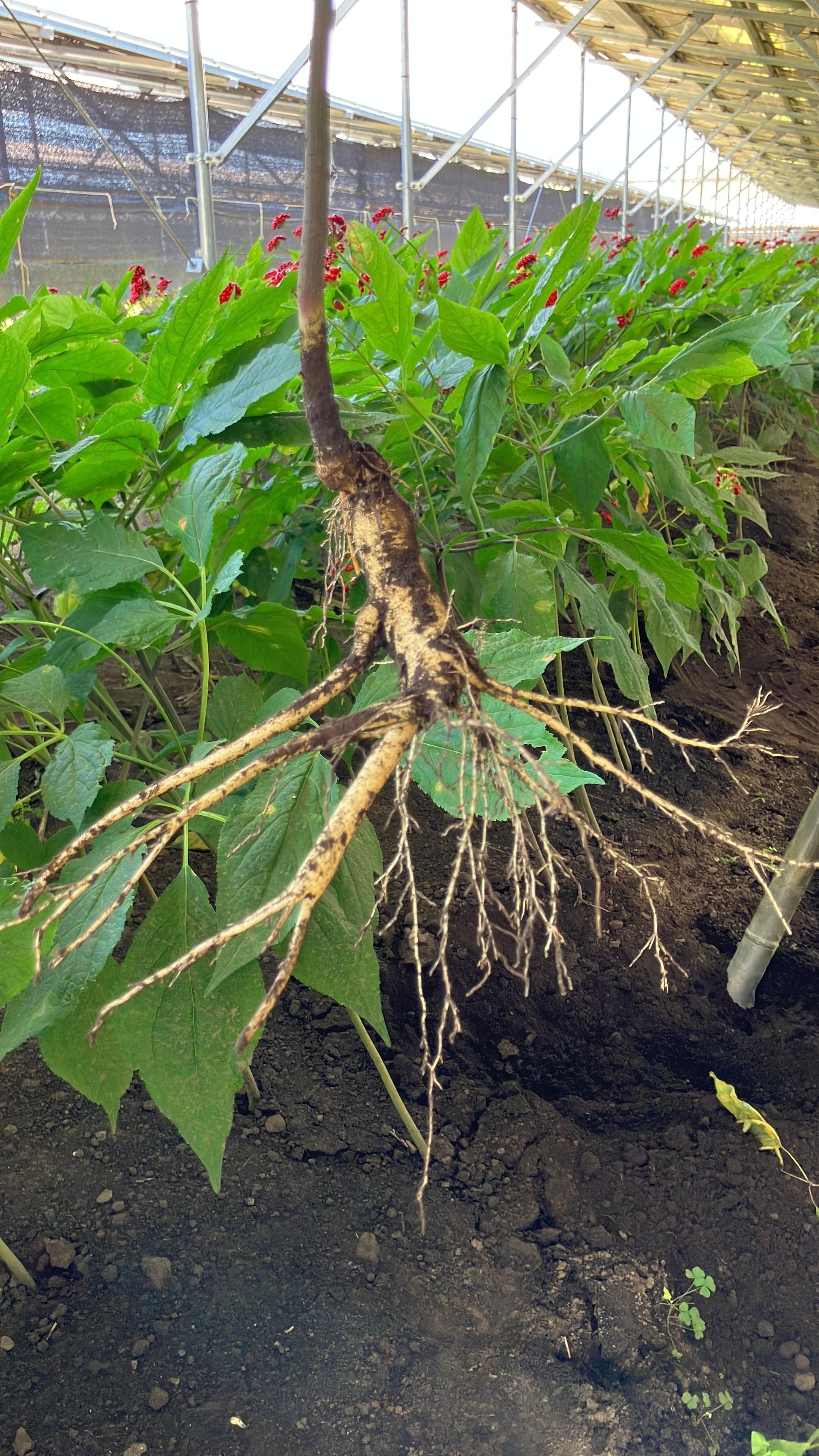 通常、朝鮮人参は5年ほどで、漢方商材として加工するために出荷されますが、減農薬で栽培期間中ほとんど肥料を与えず、ほぼ無肥料で栽培された朝鮮人参は慣行栽培のものと比べてとても緩やかに成長します。
